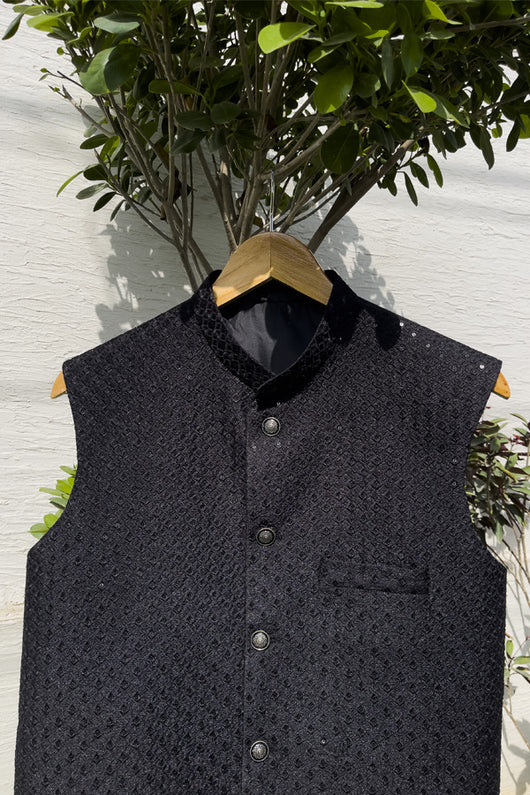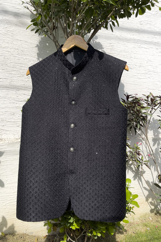A refined piece crafted from premium Maisuri fabric with elegant embroidery in timeless black. Available in multiple sizes with full customization options. For more exclusive designs, contact us directly on WhatsApp.