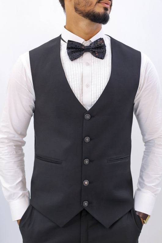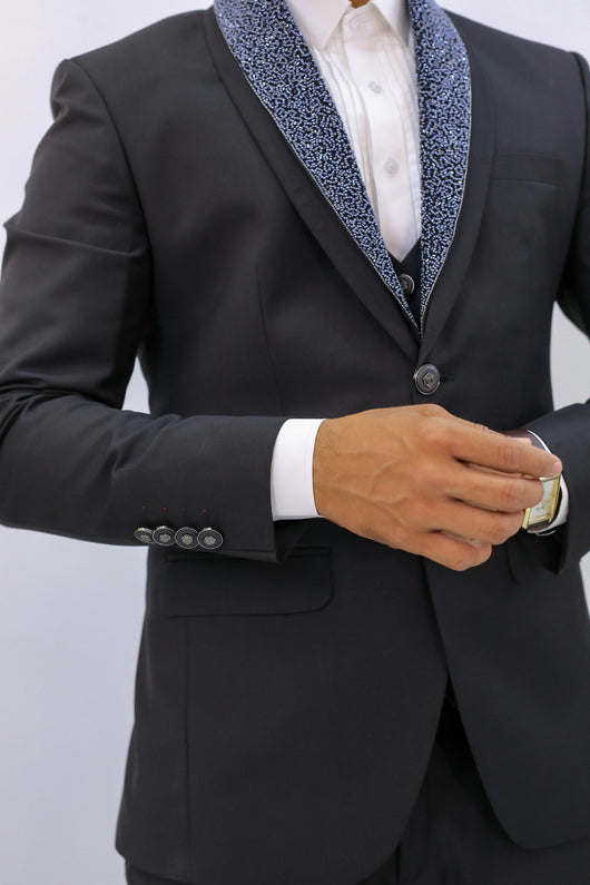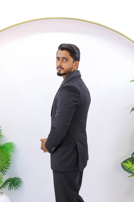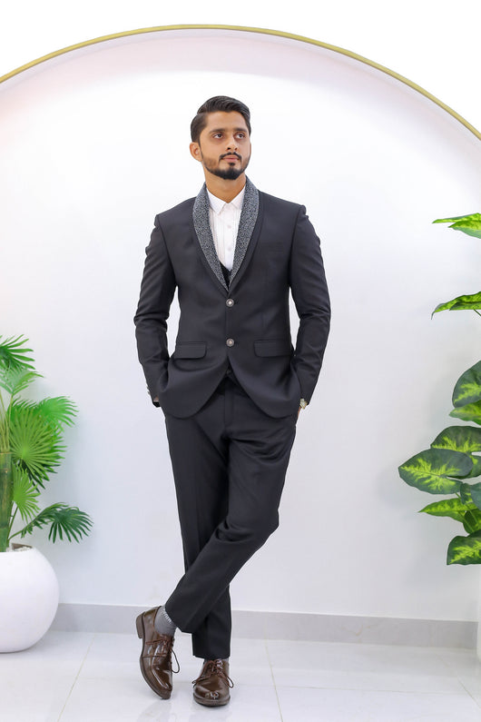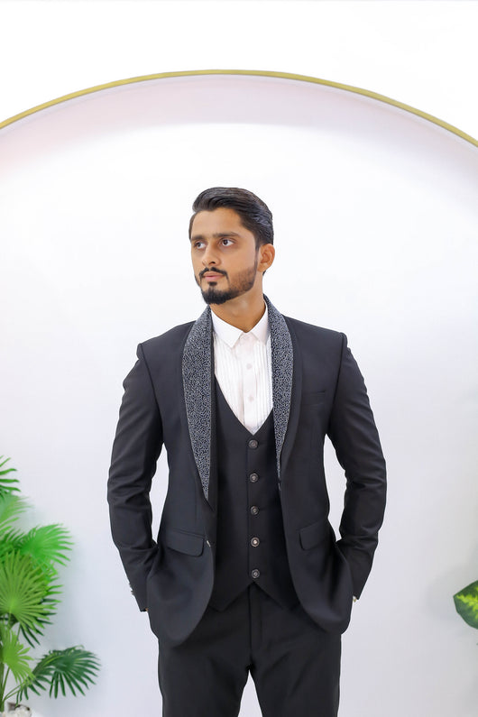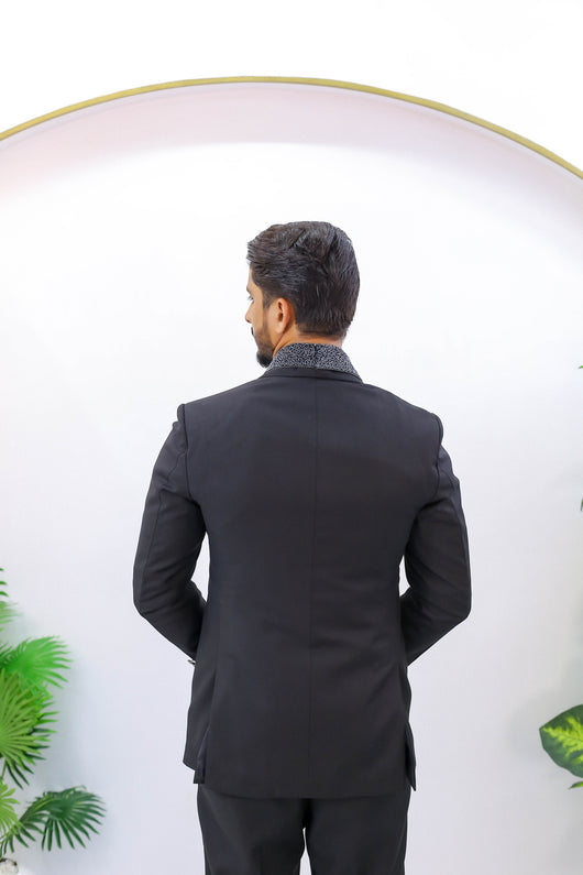 Elevate your wardrobe with our exclusive Black Tuxedo 3-Piece Suit, designed for men who appreciate refined elegance. Crafted from premium blended fabric with impeccable stitching, this tuxedo offers both style and comfort. Detailed with metallic buttons and hand embroidery, it reflects the perfect blend of sophistication and artistry.