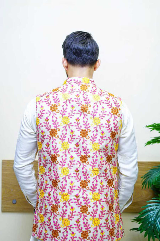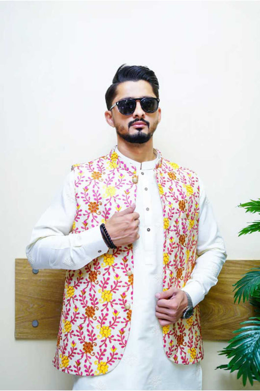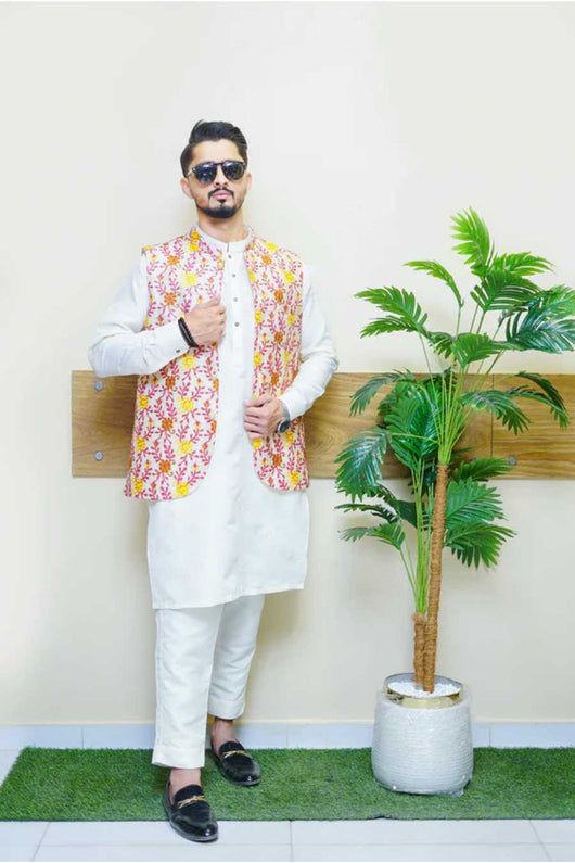 Add vibrant flair to your traditional look with this Multi Embroidered Waistcoat, paired elegantly with a classic Buti Kurta Pajama. Designed for the fashion-forward man who embraces tradition with a colorful twist, this outfit is perfect for daytime weddings, mehndi functions, or festive celebrations. The detailed embroidery and subtle buti pattern combine style and comfort effortlessly.