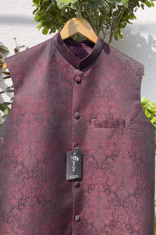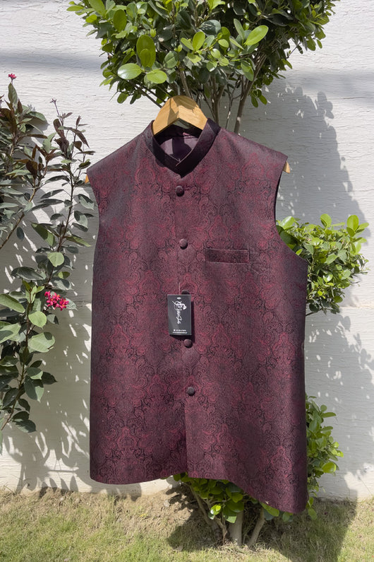 Crafted with premium jacquard fabric in a rich mehroonish black shade, this waistcoat blends elegance with tradition. Available in multiple sizes with full customization options, it’s perfect for weddings, festive wear, and formal occasions. For exclusive designs, contact us directly on WhatsApp.