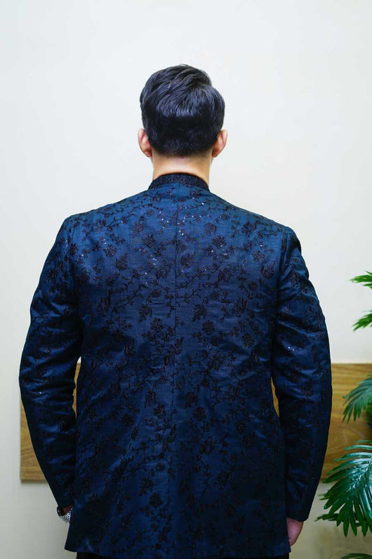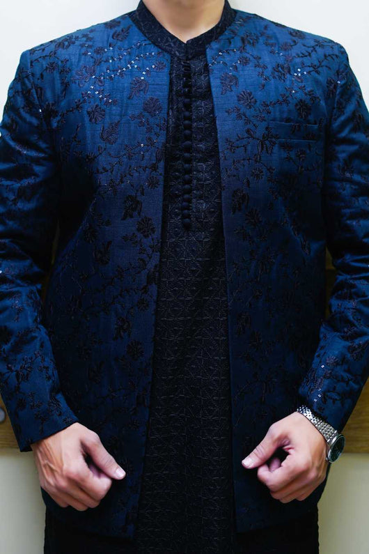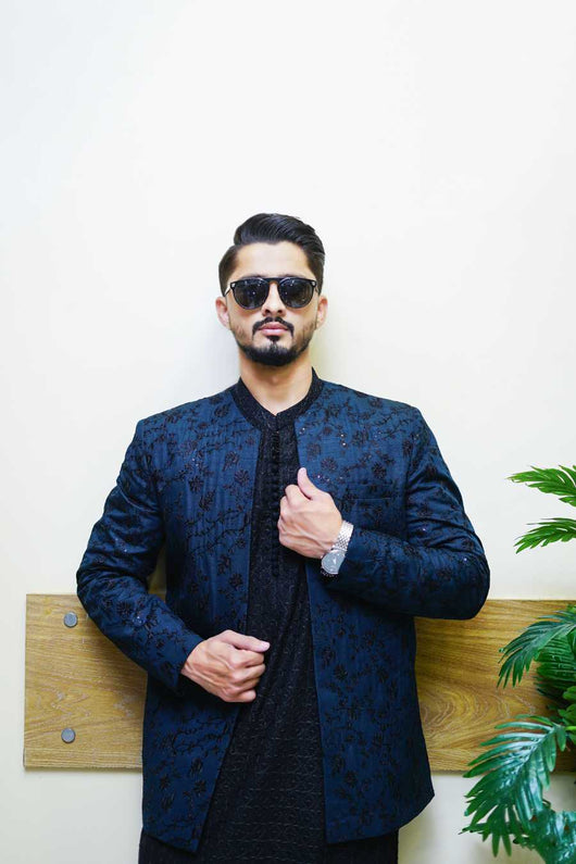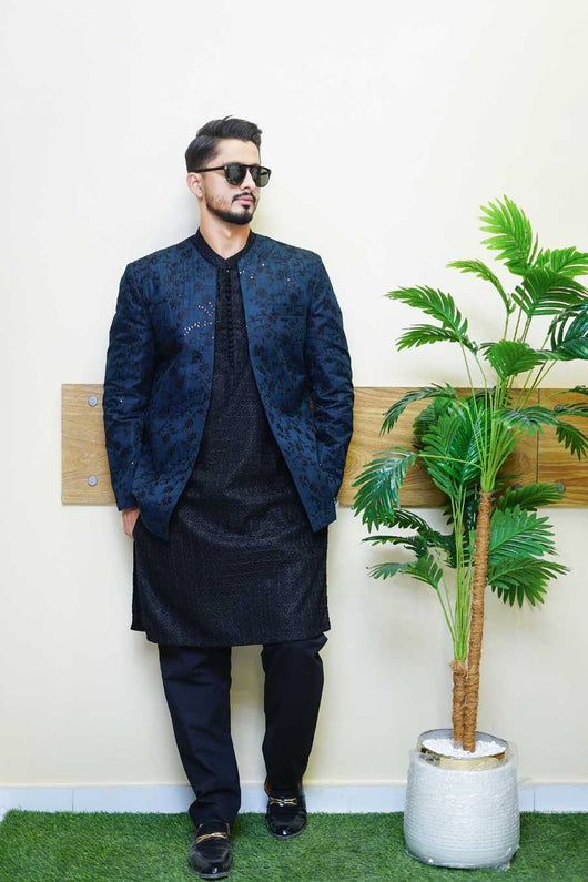 Elevate your ethnic style with our Zinc Blue Front Open Prince Coat, expertly paired with a traditional white Chikan Kari Kurta Pajama. This royal ensemble blends modern elegance with timeless tradition. The rich zinc blue hue, complemented by delicate embroidery and a contemporary front-open cut, makes it a standout outfit for weddings, formal gatherings, and festive occasions.